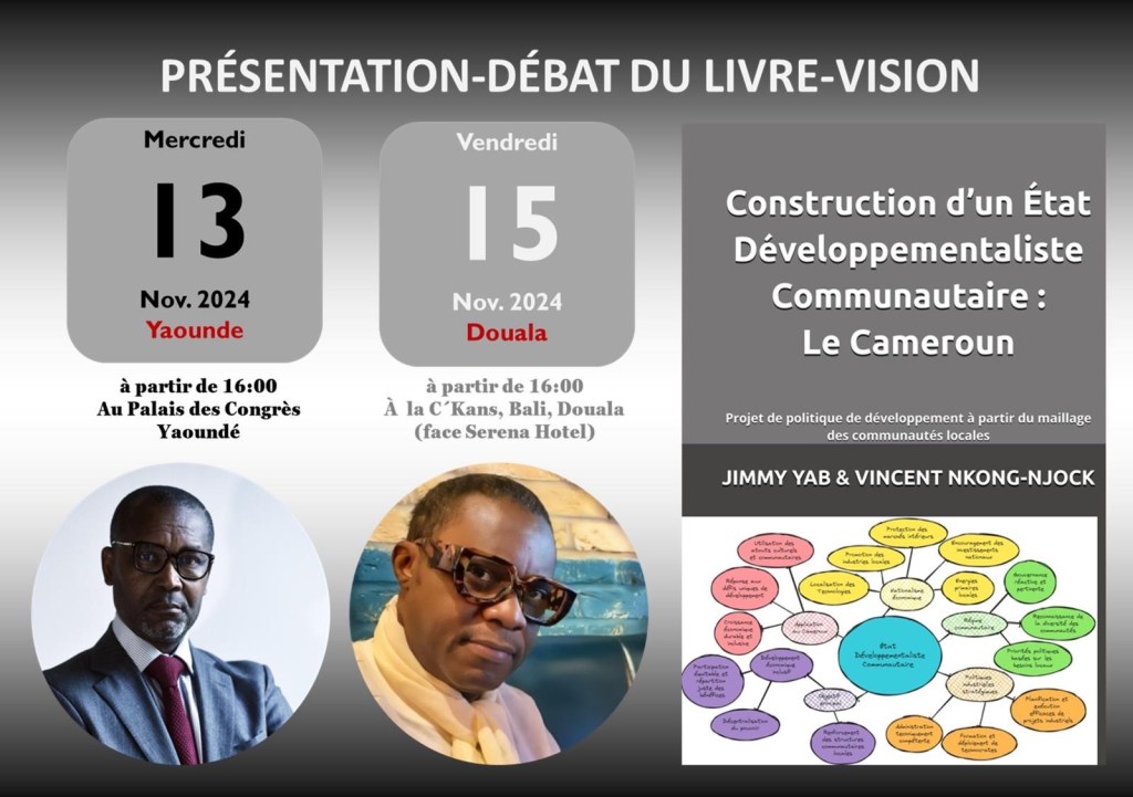 J’ai le plaisir de vous annoncer la tenue prochaine de la présentation-débat de notre nouveau livre, intitulé : « Construction d’un État Développementaliste Communautaire : Le Cameroun. Projet de politique de développement à partir du maillage des communautés locales ». Cet ouvrage propose une vision audacieuse pour le développement du Cameroun et de l’Afrique subsaharienne, basée sur une mobilisation et une structuration des communautés locales pour bâtir un modèle de développement durable et inclusif.
